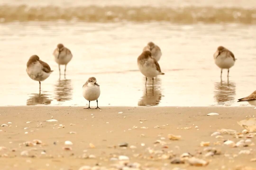 2025年10月25日在三娘灣拍攝到的野生勺嘴鷸(左三)。趙一 攝